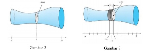 berikut perhatikan sebuah benda pejal yang penampang penampangnya tegak lurus dengan suatu garis memiliki luas yang diketahui. khususnya, misalkan garis tersebut adalah sumbuh x dan misalkan jika luas penampang dari x adalah A(x) dengan `a\leq x\leq b`(gambar 2). kita partisikan [a,b] dengan menyisipkan titik-titik `a=x_0<x_1<x_2<...<x_i=b`. Kemudian kita lewatkan bidang-bidang melalui titik-titik ini tegak lurus pada sumbu-x , sehingga mengiris benda menjadi lempengan lempengan tipis (Gambar 3). Volume `\triangle v` suatu lempengan kira-kira sama dengan volume suatu silinder, yakni